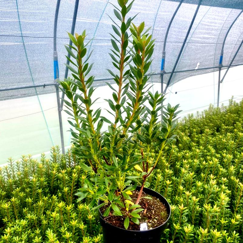 Displays pink buds and pink flowers with a miniature cinnamon ring.