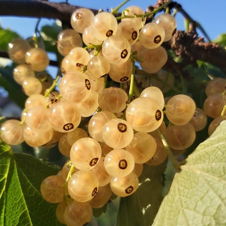 - Крупные ягоды равномерного размера, собранные, даже по несколько десятков, в гроздья (в среднем 25-40 ягод). Гроздья длинные и компактные, собирать их легко. Желто-белые плоды с видимыми белыми прожилками и семенами, просвечивающими сквозь кожуру. На вкус слегка кисловатые, со сладкой ноткой, вкусные. Плоды созревают равномерно в середине июля. Они пригодны для приготовления варенья, в том числе с добавлением других фруктов, сушки и употребления в сыром виде.