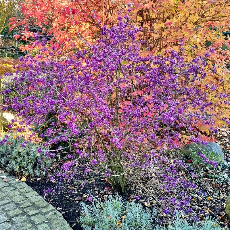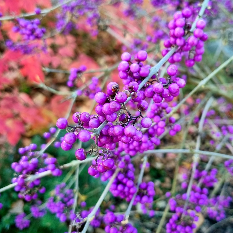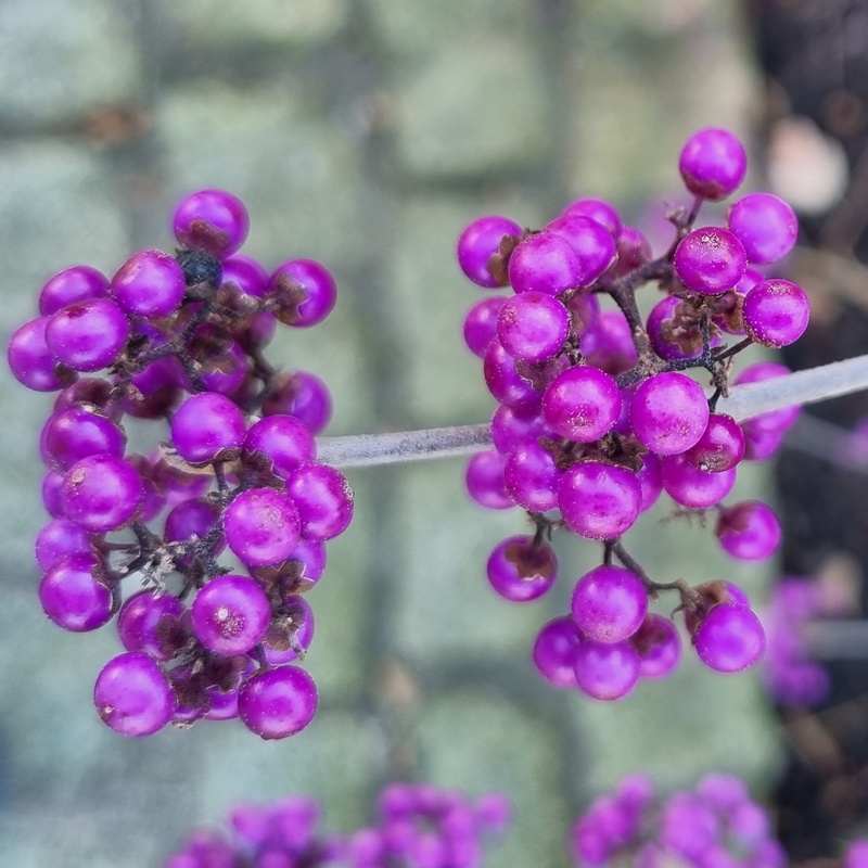 - Декоративные плоды созревают раньше и позже. Они пурпурно-фиолетовые, сферические, собраны в короткие верхушечные семенные головки на побегах. Цвет очень практичен, делая кустарник очень декоративным в это время года. Плоды остаются на кустарнике долго после опадания листьев.